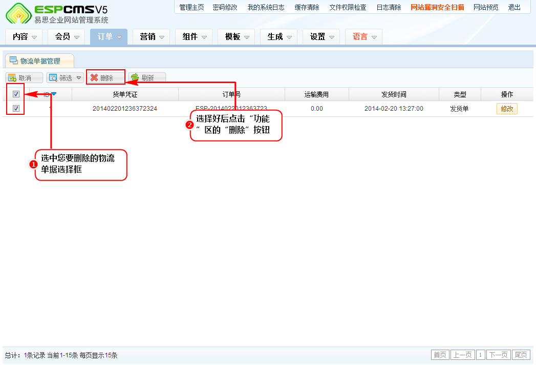 2、在物流单据列表区,选中您要删除的物流单据选择框,选择好后点击“功能”区的“删除”按钮。