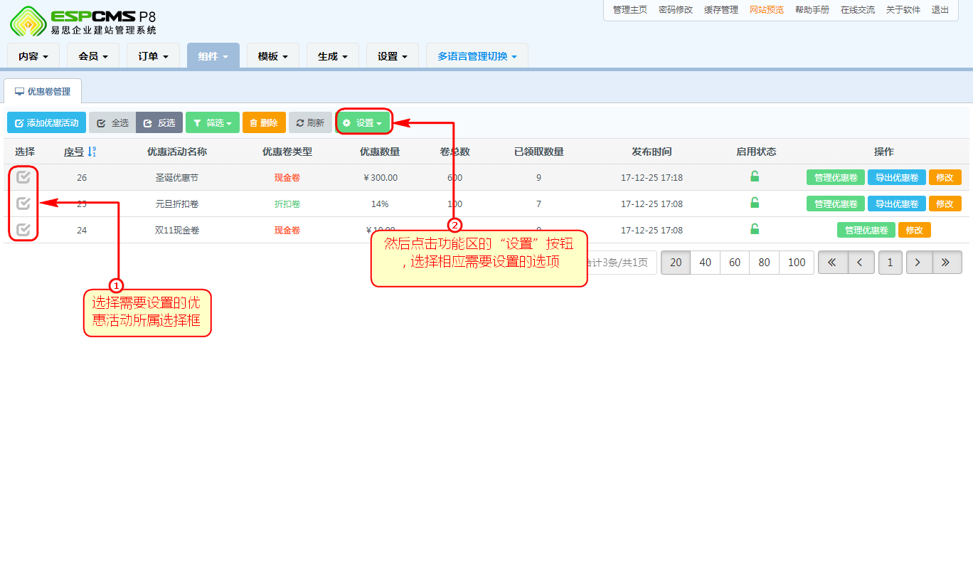 2、在优惠活动列表管理区,选择需要设置的优惠活动所属选择框;